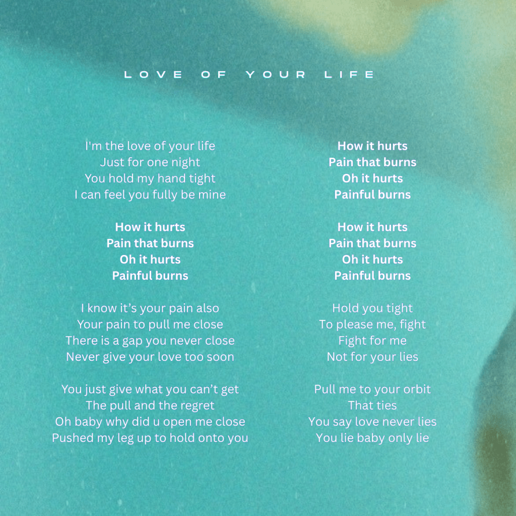 This is about a heart cracked open, then left alone to tend to its wounds. It is dark and sensual. It is a “se veled, se nélküled” relationship. Even though they never promise anything verbally, they lie and confuse through their actions.